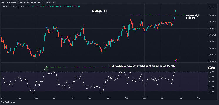 The solana-ether (SOL/ETH) spot pair trading on Binance has surged over 15% since Oct. 1, extending the three-month winning trend. The rally now looks overstretched.