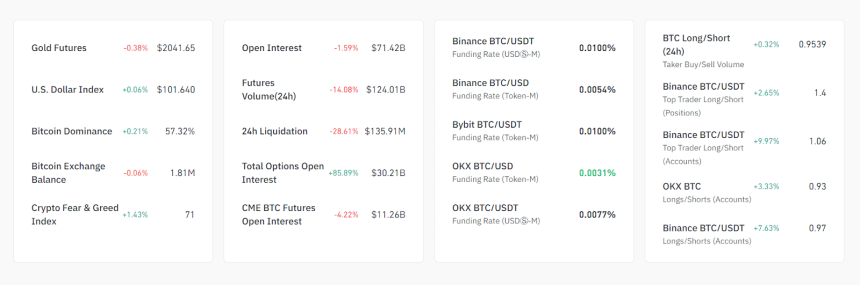 Bitcoin‘s price recently stood at $66,410.18, reflecting a 1.11% drop in 24 hours. The 24-hour trading volume reached $28.17 billion, while its market cap stood at $1.31 trillion. Despite the recent price dip, Bitcoin’s market dominance increased to 57.32%, indicating strong investor interest. The Crypto Fear and Greed Index is at 71, suggesting trader optimism. However, a 14% drop in futures volume and a 28% fall in liquidations could mean market volatility.
