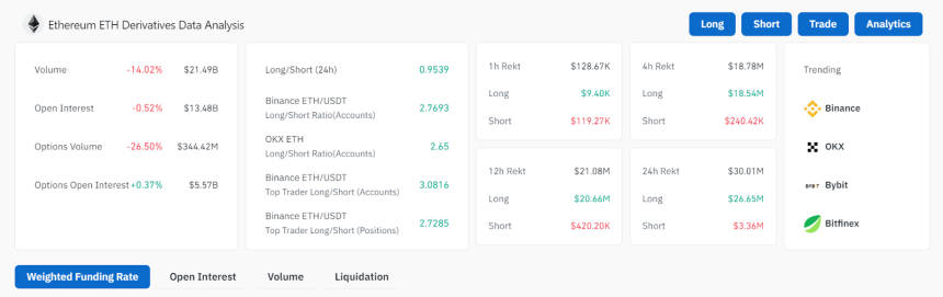 At press time, Ethereum trades at $2,582, down 1.88% over the past 24 hours, with a trading volume of $14.15 billion. Its market cap stood at $310.86 billion. Derivatives trading for Ethereum has declined, with a 14.02% drop in volume and a 26.50% decline in options trading. Open interest is stable at $13.48 billion. Traders seem to favor shorts, as shown by a 24-hour long/short ratio of 0.9539. Liquidations mainly affected long positions, totaling $26.65 million over the day.