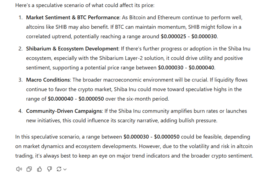 Meanwhile, AI chatbot ChatGPT is more bullish on Shiba Inu. When asked, ChatGPT presented three speculative scenarios for Shiba Inu price over the next six months. It believes a broader market rally could catalyze a Shiba Inu rally to a range of $0.000025 to $0.000030 by April 2025.