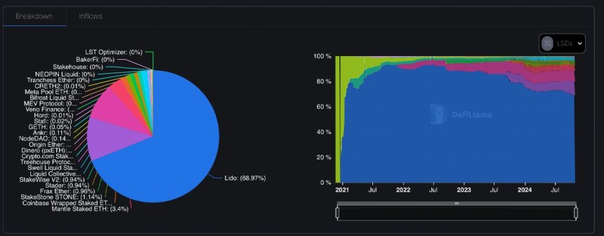 Over the past 29 days, decentralized finance (defi) liquid staking protocols added another 60,000 ETH, worth nearly $150 million. Currently, defillama.com data shows that LSD platforms collectively hold 14.14 million ETH. Lido Finance leads by a landslide, commanding 68.97% of the market with its 9.75 million ETH holdings. This is down slightly from last month, when it held 9.8 million ETH and captured 69.59% of the LSD market.