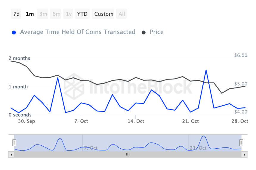 As TON holder count spikes, its holding time has also increased. IntoTheBlock‘s data shows that over the past month, the altcoin’s holding time, which tracks the length of time that coins have been held before being traded, has climbed by 249%.