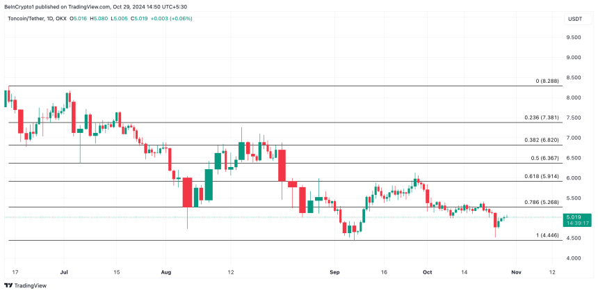 Conversely, if market sentiment shifts and selling pressure intensifies, Toncoins price may struggle to break past $5.26, potentially leading it to trend downward toward the support level at $4.44.
