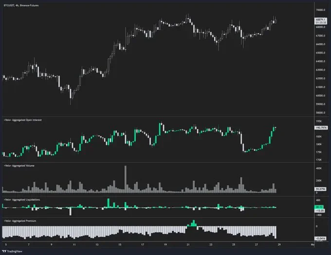 WikiBit 2024-10-29 15:36Bitcoins open interest just exploded by $1.94 billion today, with its price rallying toward the $70,