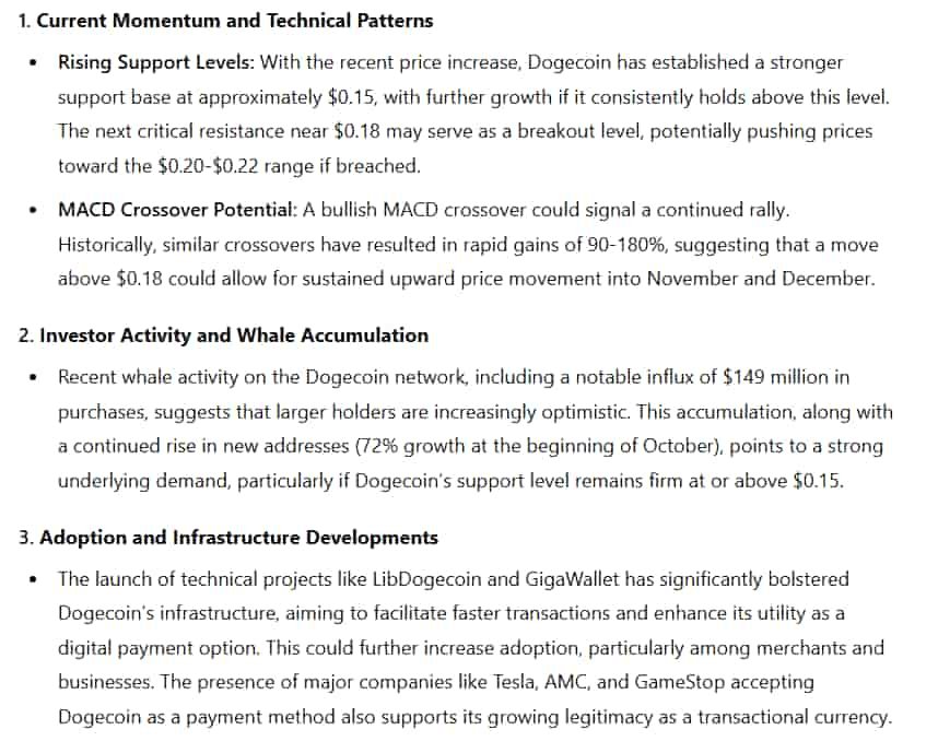 ChatGPT noted Dogecoins uptrend and indicated the potential for a bullish moving average convergence/divergence (MACD), noting it could – provided DOGE finds a footing above $0.18 – rally between 90% and 180%.