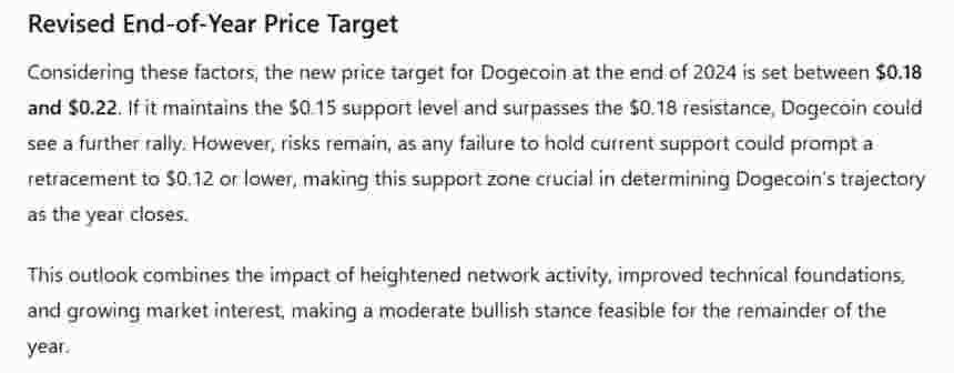 Despite the generally positive analysis, ChatGPT-4o proved cautious in setting the price target. It noted that there is a strong potential for a rally, particularly if the $0.18 resistance level is decisively overcome, and that DOGE may surge to between $0.18 and $0.22 by the end of 2024.