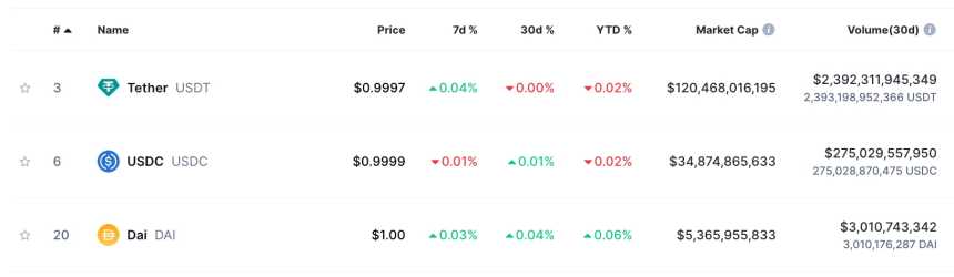 First, Maker‘s (MKR) DAI is the third largest stablecoin by market cap, with over $5.36 billion minted. It has 15% of USDC’s $34.87 billion capitalization and 4.5% of USDTs $120.47 billion market value.