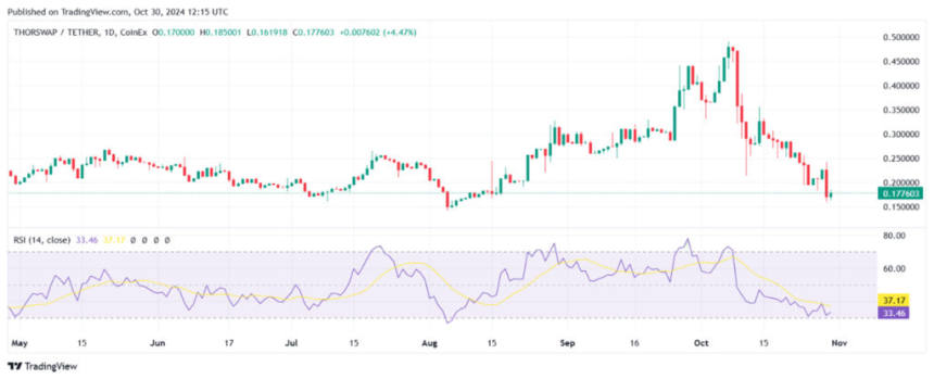 The THORSwap token price has plummeted by 55.5% over the past month, with losses of 36.9% in the past two weeks alone.
