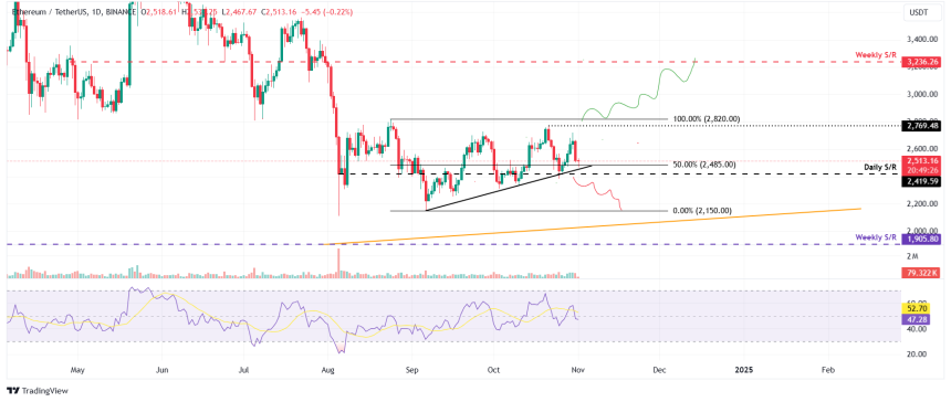 Ethereum's price is nearing its crucial support level of around $2,450 on Friday after declining over 5.4% on Thursday. This level is important as it roughly coincides with the 50% price retracement level at $2,485, the ascending trendline (drawn from joining multiple low levels with a trendline since early September) and the daily support at $2,419.