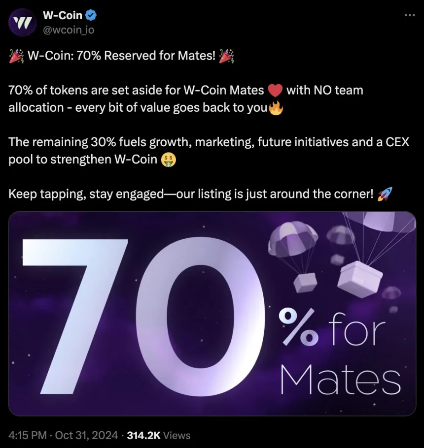 WikiBit 2024-11-01 20:36W-Coin is turning into the next tap-to-earn hot token, will reserve 70% of its tokens for the commun