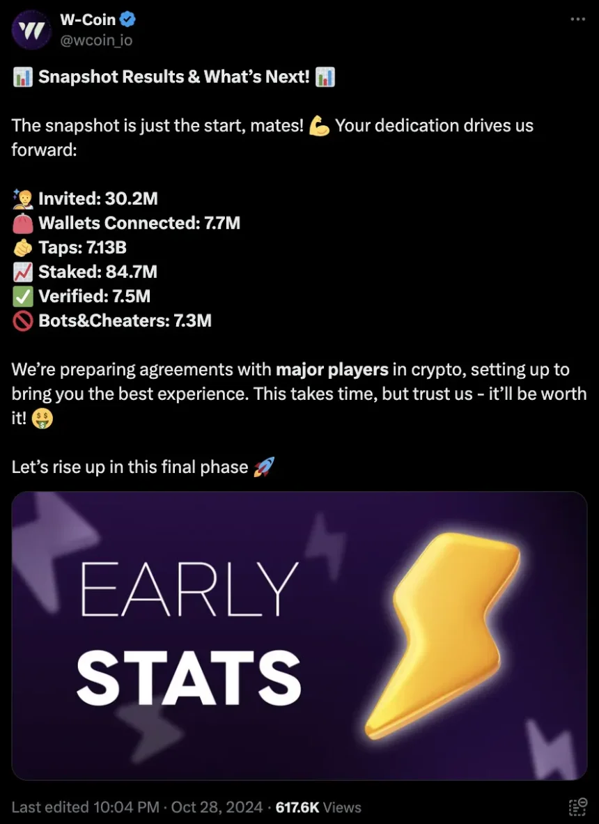 Additionally, the W-Coin team has set aside its assets for a centralized exchange listing. The approach is similar to Notcoin (NOT), which started purely through idle app activity, then graduated to a token traded on Binance.