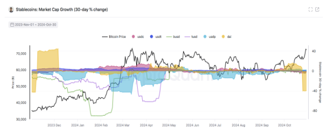 The market capitalization for the top stablecoins, including USDT, USDC, BUSD, DAI, and TUSD, has shown different trends from November 2023 to October 2024.