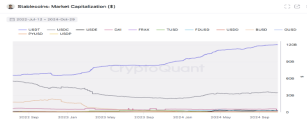 Between July 2022 and October 2024, USDT has steadily grown its market share, reaching over $120 billion by October 2024. USDC is still the second-largest stablecoin, although it has shown signs of stabilization at a lower level after early 2023.