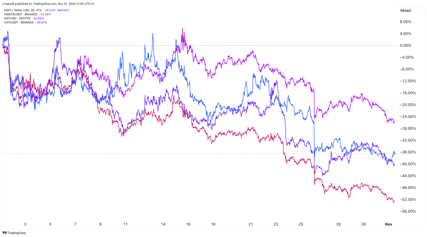 Pixelverse has also plunged by over 96% from its highest level this year, while DOGS and Catizen have all retreated.