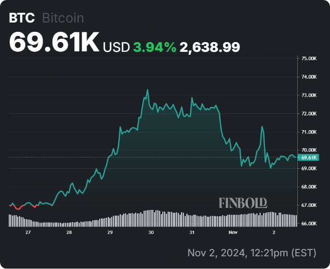 Bitcoin is consolidating below $70,000, trading at $69,590 as of press time. Over the past 24 hours, it has gained 0.20%; on the weekly chart, it is up almost 4%.
