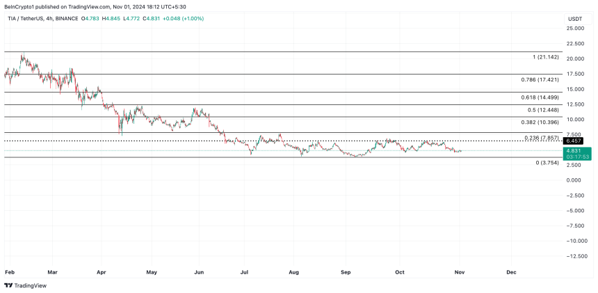 At the time of writing, TIA is trading at $4.83. Continued buying pressure could sustain its upward trend, pushing the price toward the $6.45 resistance. A successful breakout at this level could pave the way for TIA to reach a four-month high of $7.85.