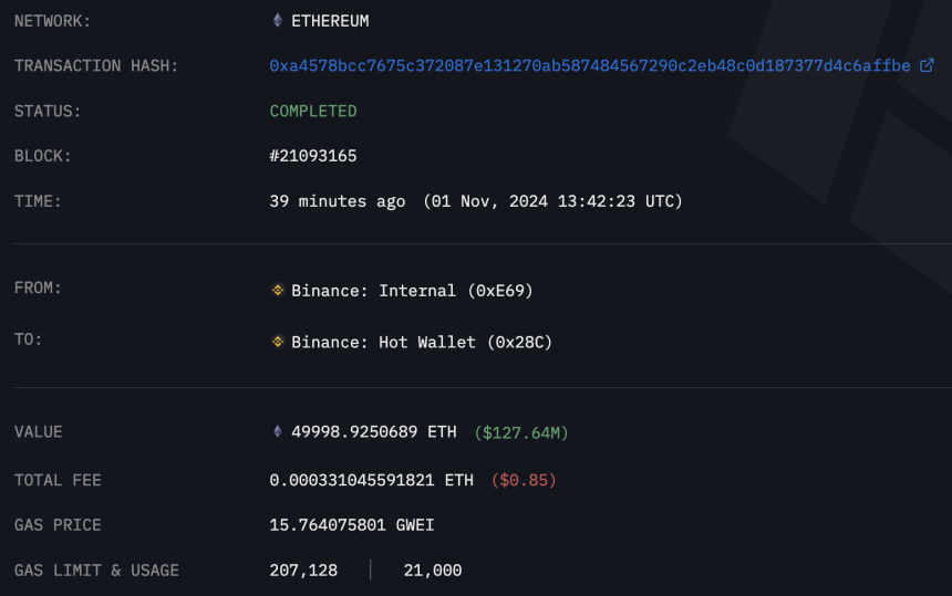 A colossal amount of Ethereum tokens worth over $127 million was sent from address “0xE69,” which Whale Alert identifies as unknown, to 0x28C, which apparently belongs to Binance.