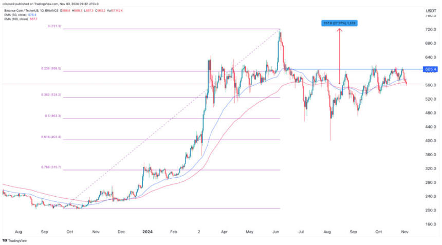 The BNB token is between the 23.6% and 38.2% Fibonacci Retracement levels. Therefore, because of the inverse H&S pattern, the coin will likely have a bullish breakout, with the next point to watch being at $605.