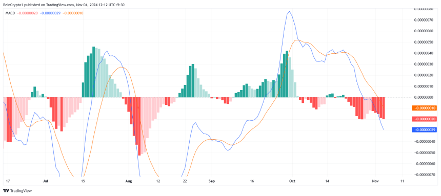 PEPE‘s macro momentum currently reflects strong bearish undertones, as shown by the Moving Average Convergence Divergence (MACD) indicator. The MACD shows a downward trajectory, highlighting a growing bearish trend for PEPE. When MACD lines point downward, it typically signals sustained selling pressure, and in PEPE’s case, this trend has been persistent. This suggests that the meme coins downtrend could extend further unless a reversal signal emerges.
