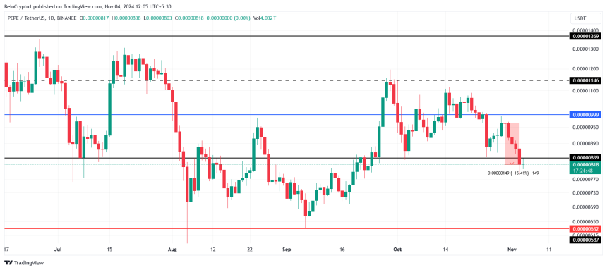 In recent days, PEPE‘s price has dropped by 15%, trading at $0.00000818, a monthly low, slipping below the critical support level of $0.00000839. This decline highlights the challenges PEPE faces, as losing the support level could signal additional downside if investors don’t step in.