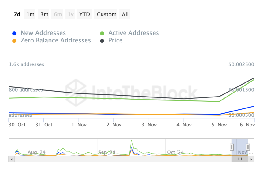 Additionally, network activity highlights a surge in investor sentiment. According to IntoTheBlock, active addresses have spiked by 130% over the past week, with new and zero-balance addresses also experiencing significant growth.