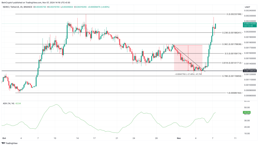 The ADX is a key technical indicator used to assess the strength of a trend. A reading below 25 typically signals weak directional momentum, but with the ADX currently at 42.49, it suggests that NEIROs uptrend is gaining strength and could continue in the near term.