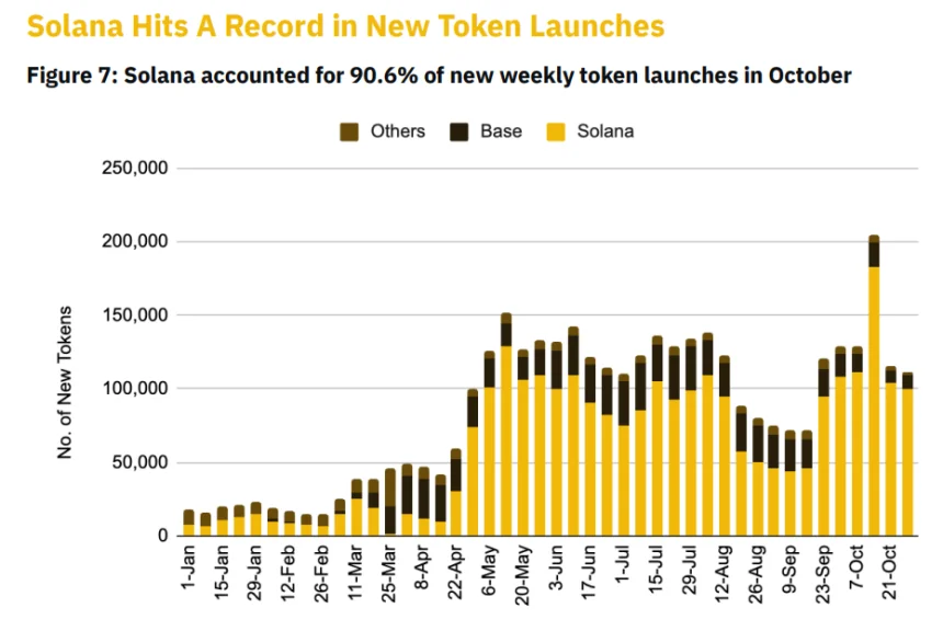 Solana felt the effect of Pump.fun, which reawakened with new records in daily token creation. After a slow month in September, the launch platform posted record earnings, while helping to launch a new batch of successful tokens. The Solana chain hit a record in new token launches, establishing a consistent dominance to other chains. Ethereum was too expensive for the rapid-trading meme token frenzy, while Base was reluctant to allow full-on betting on risky tokens.