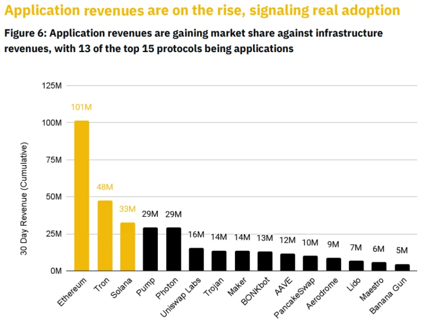 Out of the 15 highest revenue-earning entities, 13 are applications. Ethereum, Solana and TRON still retain fees, but the other big winners were platforms and apps that facilitate trading.