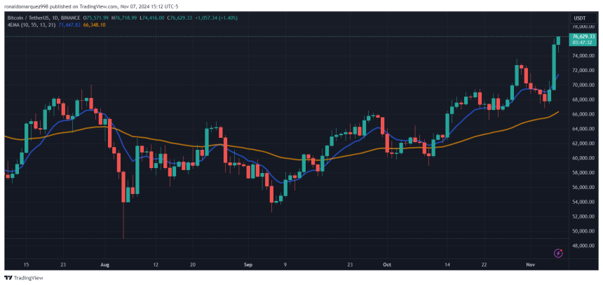 Bitcoin (BTC), the leading cryptocurrency by market capitalization, surged to a new all-time high of $76,800 buoyed by the recent US presidential election which saw Donald Trump secure another term in the White House and a more favorable monetary policy from the US Federal Reserve (Fed).