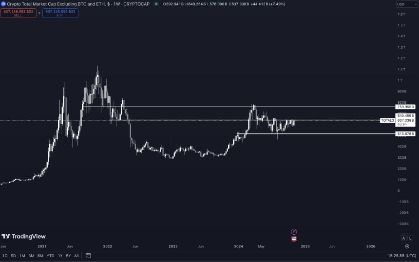 Turning to the wider altcoin market, Pentoshi says that TOTAL3, which tracks the total market cap of all crypto assets excluding Bitcoin (BTC) and Ethereum (ETH) and stablecoins, is likely to rise by about 14% from the current level.