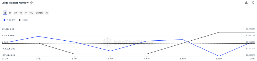 According to an analysis of the Large Holder Netflow metric, which tracks cryptocurrency flows to wallets holding at least 0.1% of the circulating supply of Shiba Inu tokens, there was an increase from -951.84 billion SHIB to 174.91 billion SHIB over the past 24 hours.