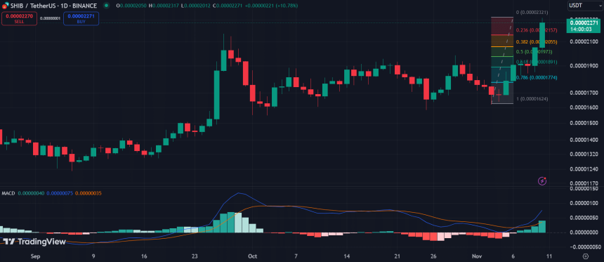 The meme coins MACD recorded a bullish crossover on Nov. 6, signaling increased positive momentum and signaling the potential continuation of the upsurge. However, SHIB consolidated for two days before resuming the rally, now trading above $0.000022.