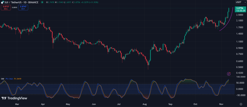 Sui spiked by a massive 20% on Nov. 9 to knock at the $3 price territory for the first time since its launch. As the new week began, SUI finally surpassed the $3 mark, claiming a $3.14 all-time peak before eventually pulling back to the $3.1 level.