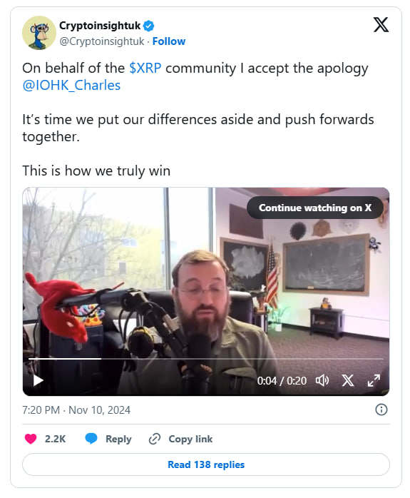 Hoskinson posted an apology video on X (formerly Twitter), stating his interest in collaborating with the XRP community and the XRP Ledger, both created by Ripple. This suggests that the tension between the two communities is easing.