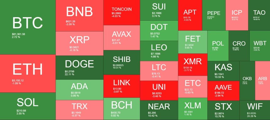However, the cryptocurrency seems to be in a full bull mode these days and broke above it late last night. It continued to run higher in the past 12 hours or so and soared to $81,800 for its latest peak. Despite retracing slightly since then, BTC is still above $81,000. This means that it is up by almost 3% on a daily scale, and over 18% weekly.