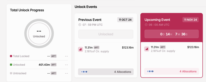 A major portion of APT tokens remains locked. On November 11, the project will distribute 11.31 million APT tokens to community members, core contributors, and investors.