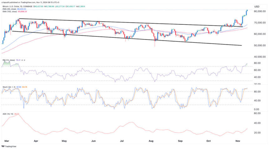 The daily chart shows that the price of Bitcoin has done well in the past few weeks. It has surged to a record high of over $81,400, and moved above the upper side of the falling broadening wedge pattern.
