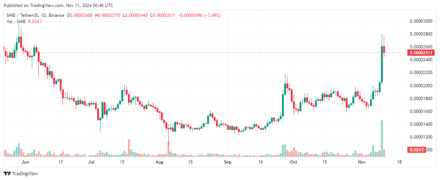 Despite SHIB‘s recent gains, the asset is still down 44.2% from its peak price of $0.000045, registered in March. Nonetheless, as the market continues to react positively to Donald Trump’s re-election, which promised to support fairer and clearer regulations, SHIB could surpass the $0.000045 mark, taking it close to its previous ATH record of $0.00008616.