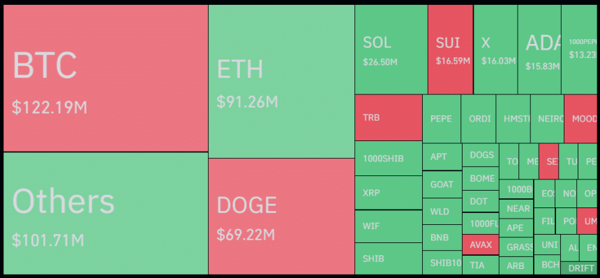 Bitcoin saw $122.1 million in liquidations —$37.5 million longs and $84.6 million shorts — per Coinglass data. This was majorly due to the flagship assets rally to a new all-time high of $81,858 with a $1.6 trillion market cap today.