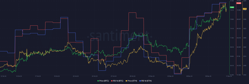 Ethereum witnessed a similar movement as its price surpassed $3,200 — the ETH RSI is currently at 74.