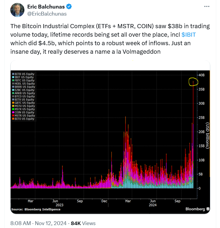 WikiBit 2024-11-12 07:54The US spot Bitcoin ETFs, MSTR and COIN combined for a record $38 billion in trading volume — smashing its previous record of $25 billion.