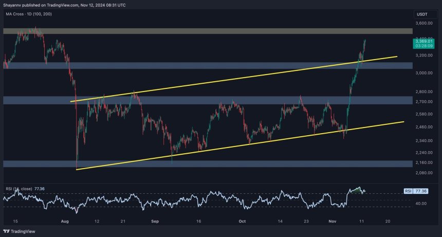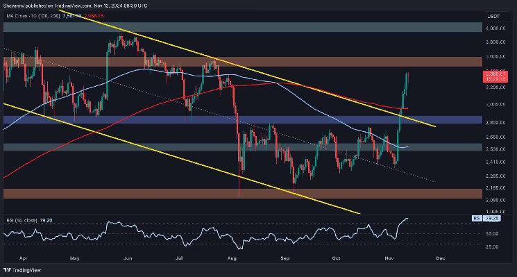 The influx of new participants and investors on the daily chart has led to an impulsive uptrend, driving Ethereums price above the 100-day and 200-day moving averages. This momentum led to a decisive break above both the 200-day MA at $2.9K and the psychological $3K resistance level, a clear indicator of a bullish shift as the market flushes out short positions.