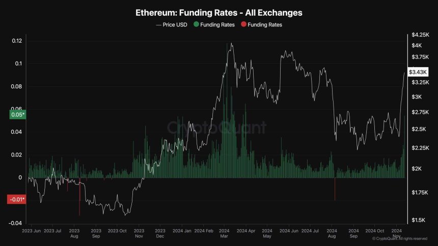 Examining the funding rates for ETH futures, it can be observed that the metric has remained positive in recent weeks, signaling a bullish sentiment in the market. This optimism spiked sharply when Ethereum crossed the $3K threshold, a pattern similar to the rally in March 2024 that also led to an ATH.