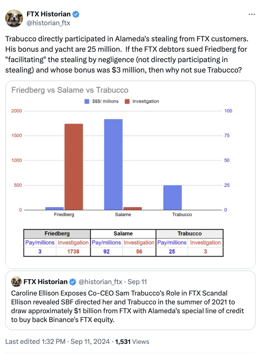 WikiBit 2024-11-12 05:32Former Alameda Research co-CEO Sam Trabucco settled with FTX in bankruptcy court with an agreement to transfer $11.2 million in assets to FTX, resolving claims and saving legal costs.