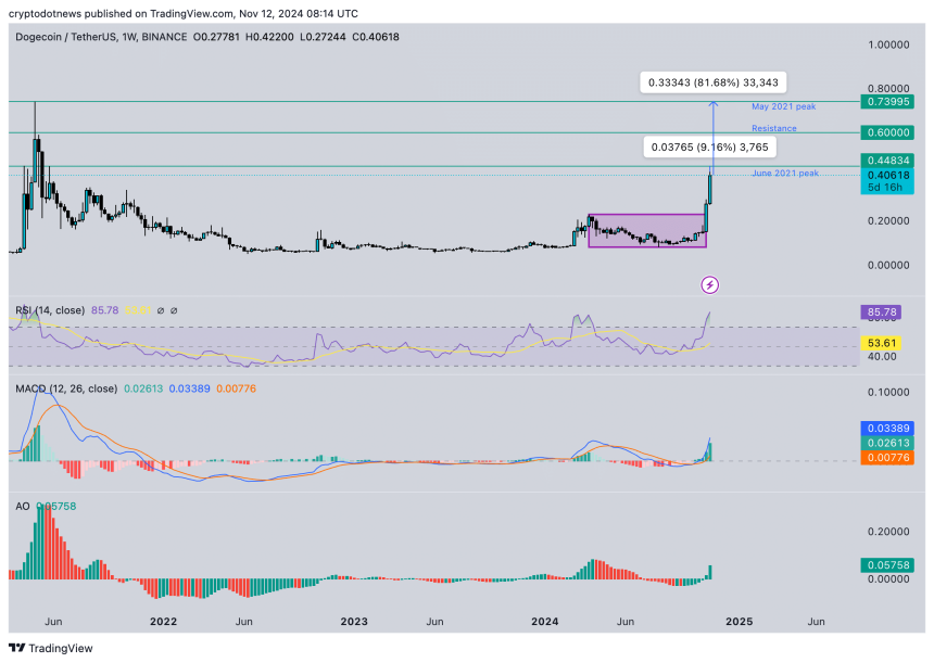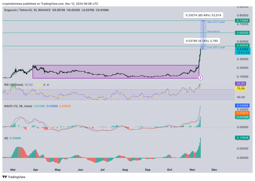Dogecoin (DOGE) rallied to a high of $0.42200 on November 12, its highest level in nearly three years. The largest meme coin is likely primed for further gains as technical indicators suggest the uptrend could continue.