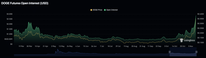 The open interest in Dogecoin noted a large spike, climbed to $2.86 billion on Tuesday, November 12. This is the highest level in nearly three years. Coinglass data shows a 38% increase in open interest in the last 24 hours.