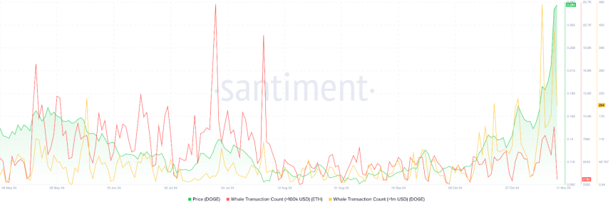 Large wallet investors, labeled as whales, increased their Dogecoin transactions on November 6 and 10. The two events are marked as large spikes in the whale transaction count chart on Santiment.