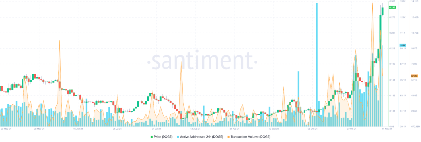 The count of active addresses is an on-chain metric that helps identify the relevance of a token among crypto traders. Active address count noted a spike on November 6 and 10, alongside a spike in transaction volume. Similar spikes correspond to local price tops for Dogecoin, as seen in the Santiment chart below.