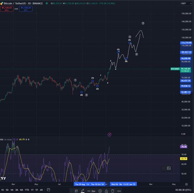 Bluntz practices the Elliott Wave theory, which states that a bullish asset tends to witness a five-wave upside move. Based on the traders chart, he seems to predict that in the short term, Bitcoin will pull back to the $80,000 level before moving higher.