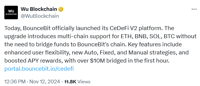 WikiBit 2024-11-13 10:04BounceBit, a centralized decentralized finance (CeDeFi) protocol, launched CeDeFi V2. Incidentally,
